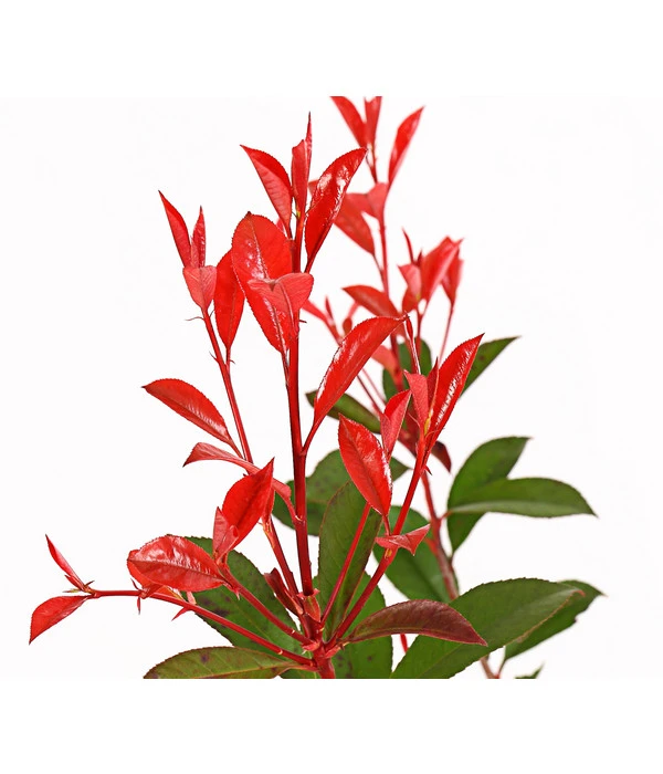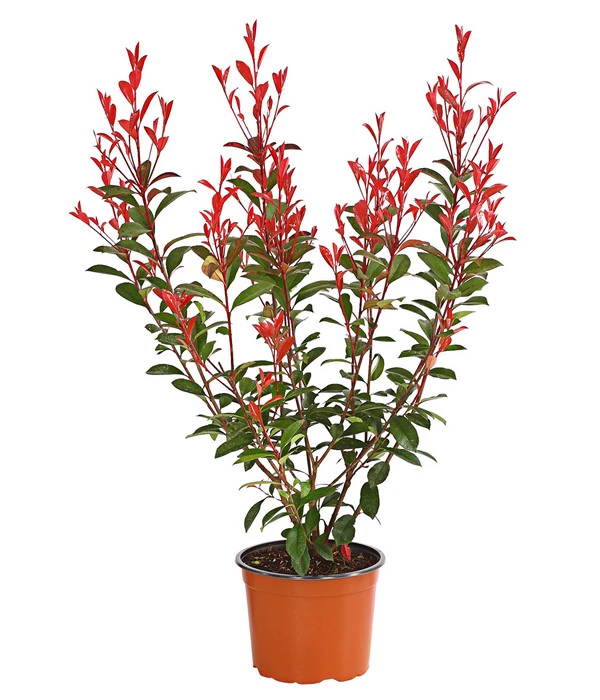 Viele Bäume und Sträucher ziehen sich im Herbst ein besonders leuchtendes Laubkleid an, die Purpur-Glanzmispel aber dreht den Spieß um und startet in die neue Saison mit einem so feuerroten Blattaustrieb, dass Sie kaum die Augen von dem Ziergehölz abwenden können. Besonders eindrucksvoll wirken die frischen, roten Blätter im Kontrast zu den älteren sattgrünen. Im Mai kommen dann noch hübsche, weiße Blütenrispen dazu, die den optischen Reiz der Purpur-Glanzmispel noch erhöhen. Und auch, wenn die Blüten verblüht und sich das spektakuläre Farbspiel im Laufe der nächsten Monate abschwächt, wird die Photinia ‘Glanzkopf‘, wie diese Purpur-Glanzmispel auch heißt, doch eine ausdrucksstarke Akzentpflanze in der Gartenanlage bleiben. Dazu trägt auch der kompakte, breit aufrechte Wuchs bei, der sich, wenn ein Gärtner kein Veto einlegt, bis in Höhen von maximal 3-5 m entwickeln kann. Die Photinia kann als dekorativer Solist gesetzt werden, sie mischt aber auch Gehölzgruppen aus Forsythie, Pfeifenstrauch und Jasmin auf, eignet sich als Heckenpflanze und kann sogar in einem großen Pflanzkübel Terrassen und Balkone schmücken.